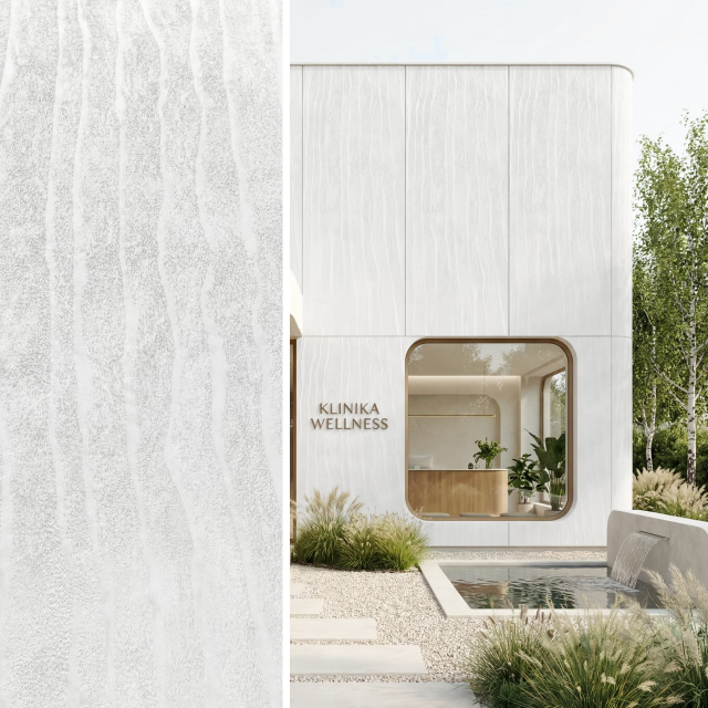 Fassadenplatte Onda Mineral Bianco 3000×1200 mm – Quarz-Verbundstoff, dekoratives Fassadenpaneel ist ein dekoratives Paneel für moderne Innen- oder Fassadenanwendungen. Das Modell verbindet eine markante Optik mit geringer Materialstärke, einfacher Montage und hoher Beständigkeit im täglichen Gebrauch.