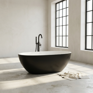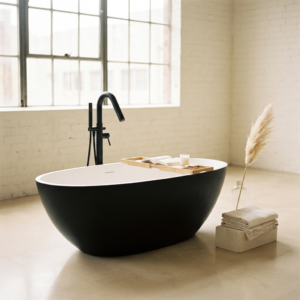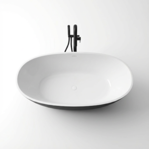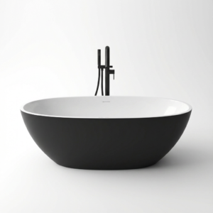 Freistehende Badewanne BURSZTEEN H-5 NERO 170x78x56 cm – schwarz mat weiß ist ein hochwertiges Badobjekt mit markanter Formensprache und dekorativer Oberfläche. Das Modell wurde für moderne Premium-Bäder entwickelt und verbindet Designwirkung mit pflegeleichter Oberfläche.