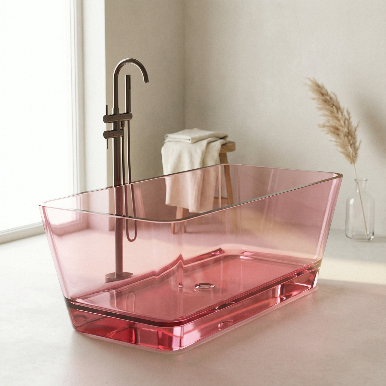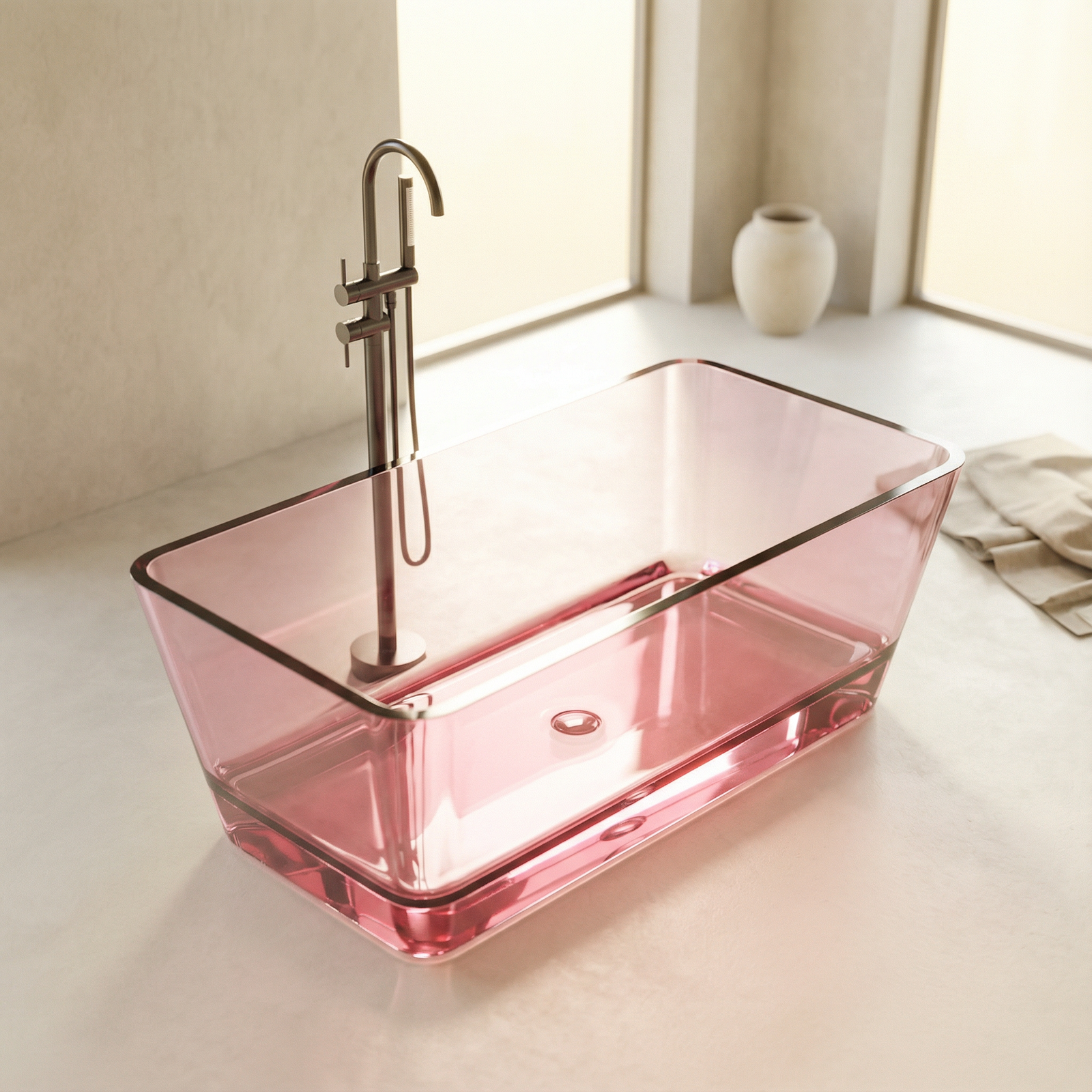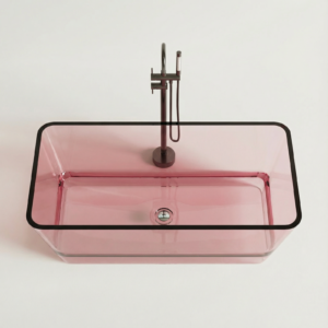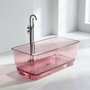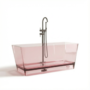 Freistehende Badewanne BURSZTEEN H-8806 150x80x56 cm – rosa transparent ist ein hochwertiges Badobjekt mit markanter Formensprache und dekorativer Oberfläche. Das Modell wurde für moderne Premium-Bäder entwickelt und verbindet Designwirkung mit pflegeleichter Oberfläche.