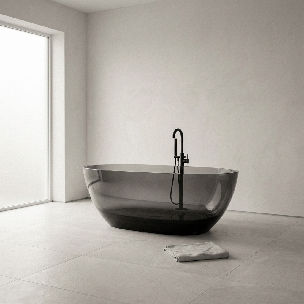 Je nach Ausführung kommt transparentes Polymerharz, Artificial Stone oder ein Mineralverbundstoff zum Einsatz. Das Material ist pflegeleicht und für den Einsatz im Bad geeignet.