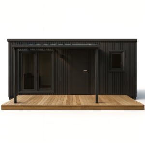 Mikrodom H1 jest idealnym rozwiązaniem w wielu sytuacjach. Może pełnić rolę pierwszego własnego domu, biura w ogrodzie, zaplecza socjalnego dla pracowników czy obiektu pod wynajem. Neutralna elewacja w kolorze antracytowym (z opcją czarnej lub złoty dąb) sprawia, że budynek harmonijnie wpisuje się w każde otoczenie. To przestrzeń, którą łatwo dopasować do własnych potrzeb i stylu życia.