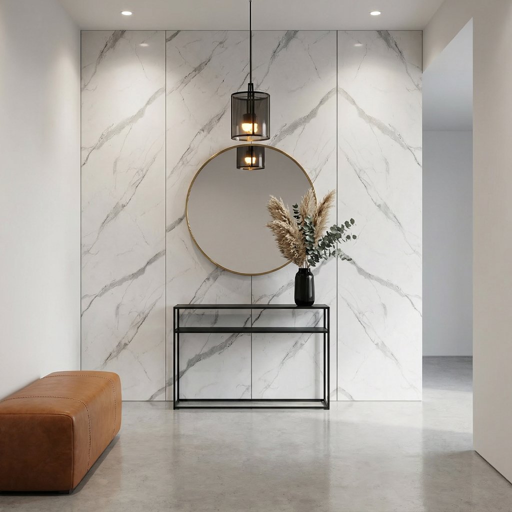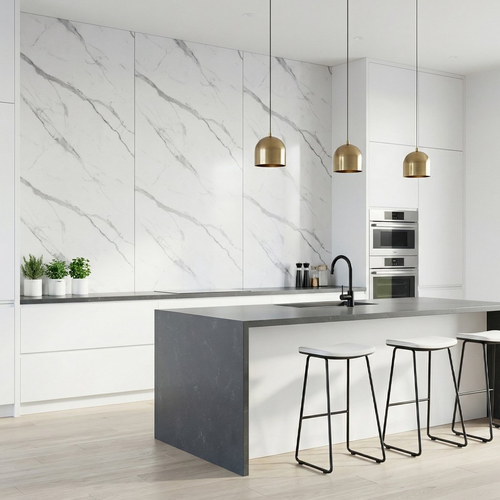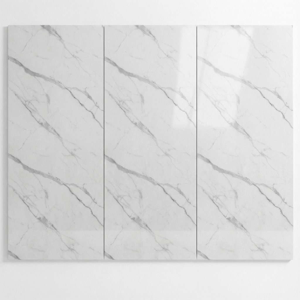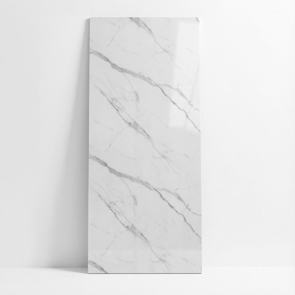 Panele wykonane z włókna węglowego i kompozytu polimerowego · Grubość 5 mm zapewnia lekkość i stabilność · Powierzchnia o wzorze gładkiego białego marmuru · Elastyczna konstrukcja dopasowująca się do powierzchni