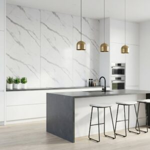Panel ścienny C-PANEL PRO A972 o wymiarach 2900×1220 mm wykonany z włókna węglowego i kompozytu polimerowego. Grubość panelu wynosi 5 mm, co zapewnia lekkość i łatwość montażu. Wzór gładkiego białego marmuru nadaje wnętrzom elegancki charakter. Panel charakteryzuje się odpornością na wilgoć oraz łatwością czyszczenia. Przeznaczony do zastosowania na ścianach wewnętrznych w domach i przestrzeniach komercyjnych.
