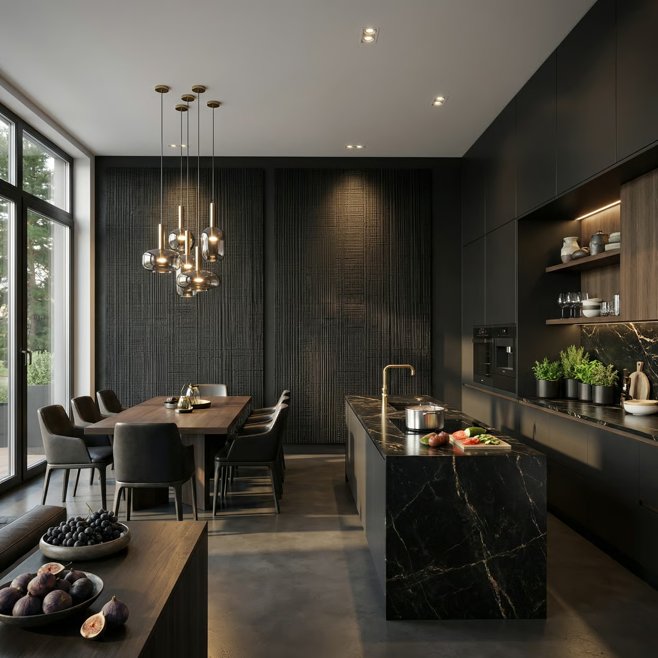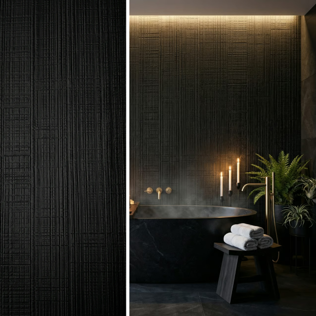 Panel ścienny ETNO Mineral Czarny o wymiarach 3000×1200 mm to nowoczesny materiał wykończeniowy wykonany z kompozytu kwarcowo-polimerowego. Produkt powstaje poprzez wytłaczanie zmielonego kwarcu i polimeru pod bardzo wysokim ciśnieniem. Charakteryzuje się teksturą inspirowaną tradycyjną afrykańską sztuką rzeźbiarską, tworząc nieregularną kratę żłobionych bloków. Panel zapewnia pełną wodoodporność, odporność na zarysowania oraz promieniowanie UV. Grubość 7 mm umożliwia montaż bez znaczącej ingerencji w przestrzeń pomieszczenia.