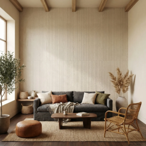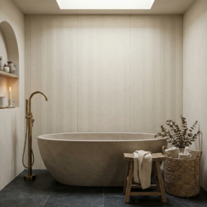 Panel ścienny Line Mineral Crema 3000×1200 mm. Kompozyt kwarcowy o teksturze szczotkowanego kamienia. Wodoodporny. Do wnętrz i elewacji.