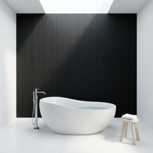 Panel ścienny Line Mineral Nero o wymiarach 3000×1200 mm to nowoczesny materiał wykończeniowy wykonany z kompozytu kwarcowo-polimerowego. Wytwarzany metodą wytłaczania pod wysokim ciśnieniem, charakteryzuje się grubością zaledwie 7 mm. Powierzchnia z pionowymi żłobieniami tworzy regularną teksturę przypominającą szczotkowany kamień lub ryflowany beton. Pełna wodoodporność i odporność na zarysowania zapewniają długotrwałą eksploatację. Przeznaczony do montażu na ścianach wewnętrznych i elewacjach zewnętrznych w obiektach mieszkalnych i komercyjnych.