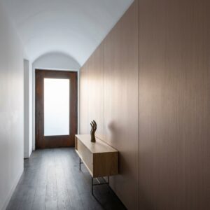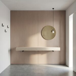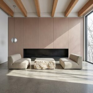 Okładziny ścienne w salonach, sypialkach, biurach i przestrzeniach komercyjnych. Zabudowy meblowe — fronty szaf, panele TV, elementy wykończeniowe. Pasuje do wnętrz skandynawskich, minimalistycznych i nowoczesnych klasycznych. Komponuje się z betonowymi powierzchniami, białymi meblami i naturalnymi akcentami. Nie stosować na zewnątrz — brak potwierdzonej odporności UV
