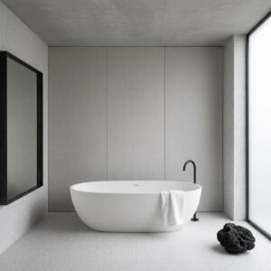 Wodoodporność potwierdzona nasiąkliwością ≤0,5% umożliwia stosowanie w wilgotnych pomieszczeniach. Kompozyt PVC/CaCO₃ wykazuje odporność biologiczną — nie rozwija się na nim pleśń ani grzyby. Stabilność wymiarowa zapewniona 60% udziałem wypełniacza mineralnego w rdzeniu panelu. Izolacyjność termiczna wyższa niż ceramiki czy kamienia naturalnego przy grubości zaledwie 5 mm. Odporność na detergenty i środki czystości o niskim stężeniu kwasów i zasad