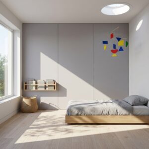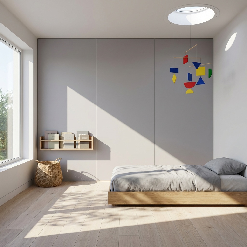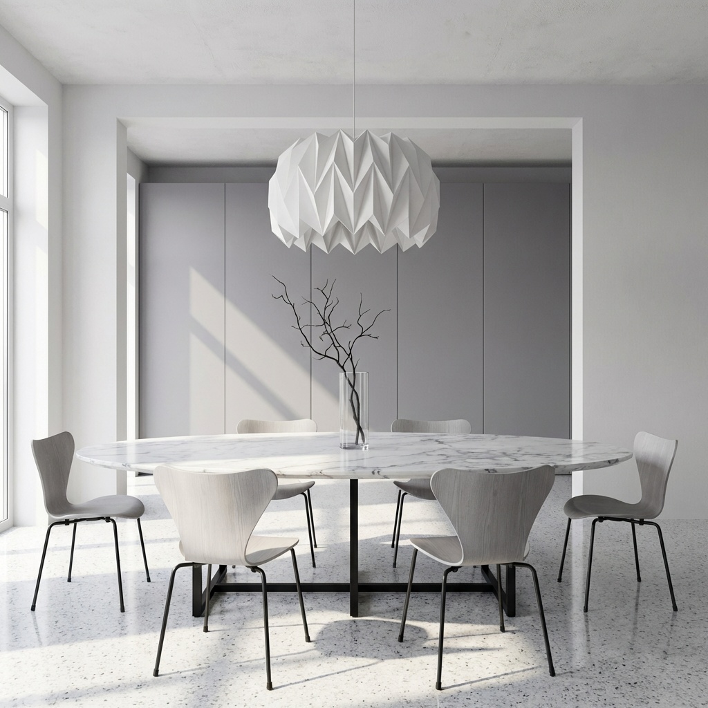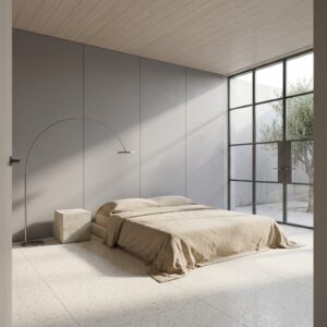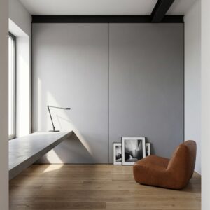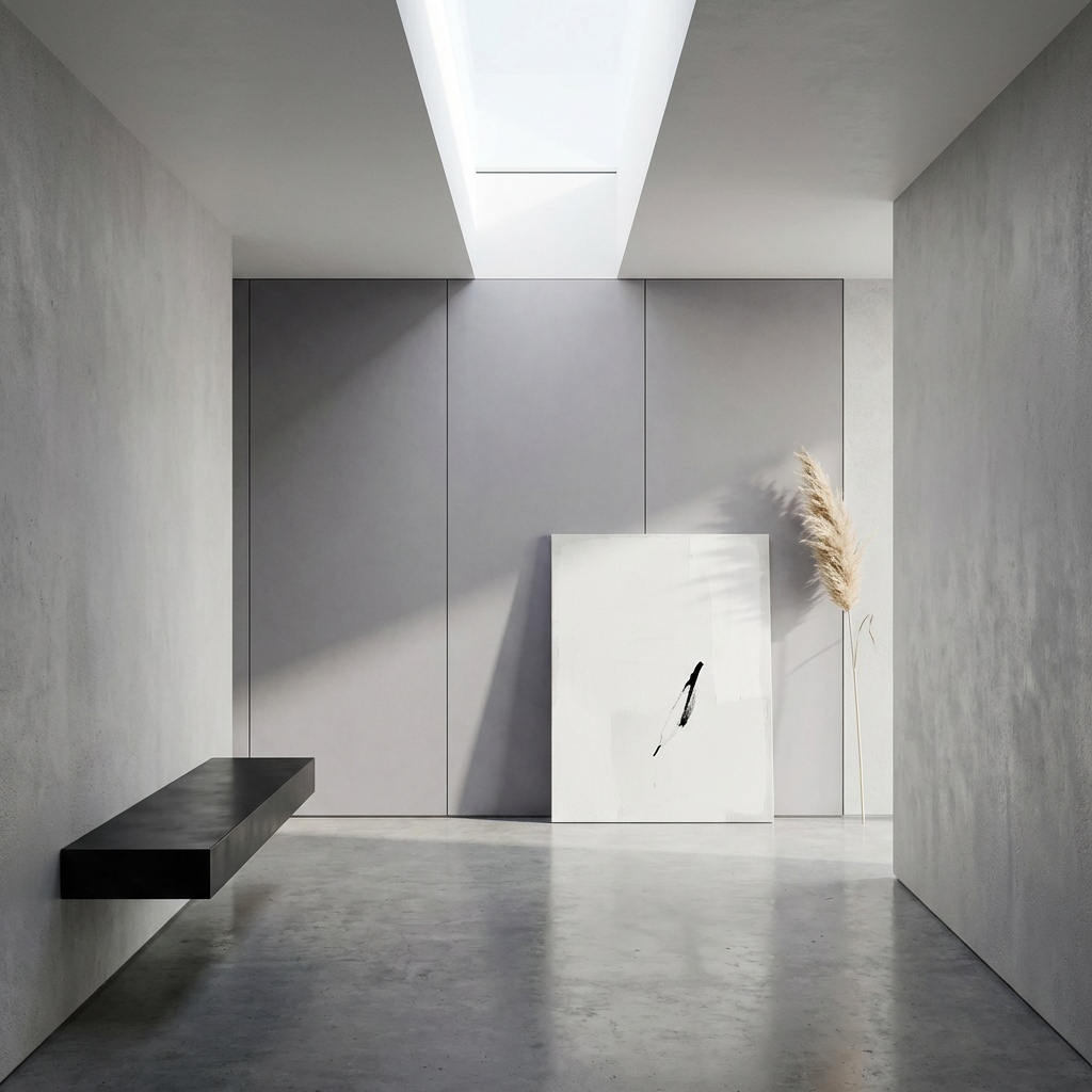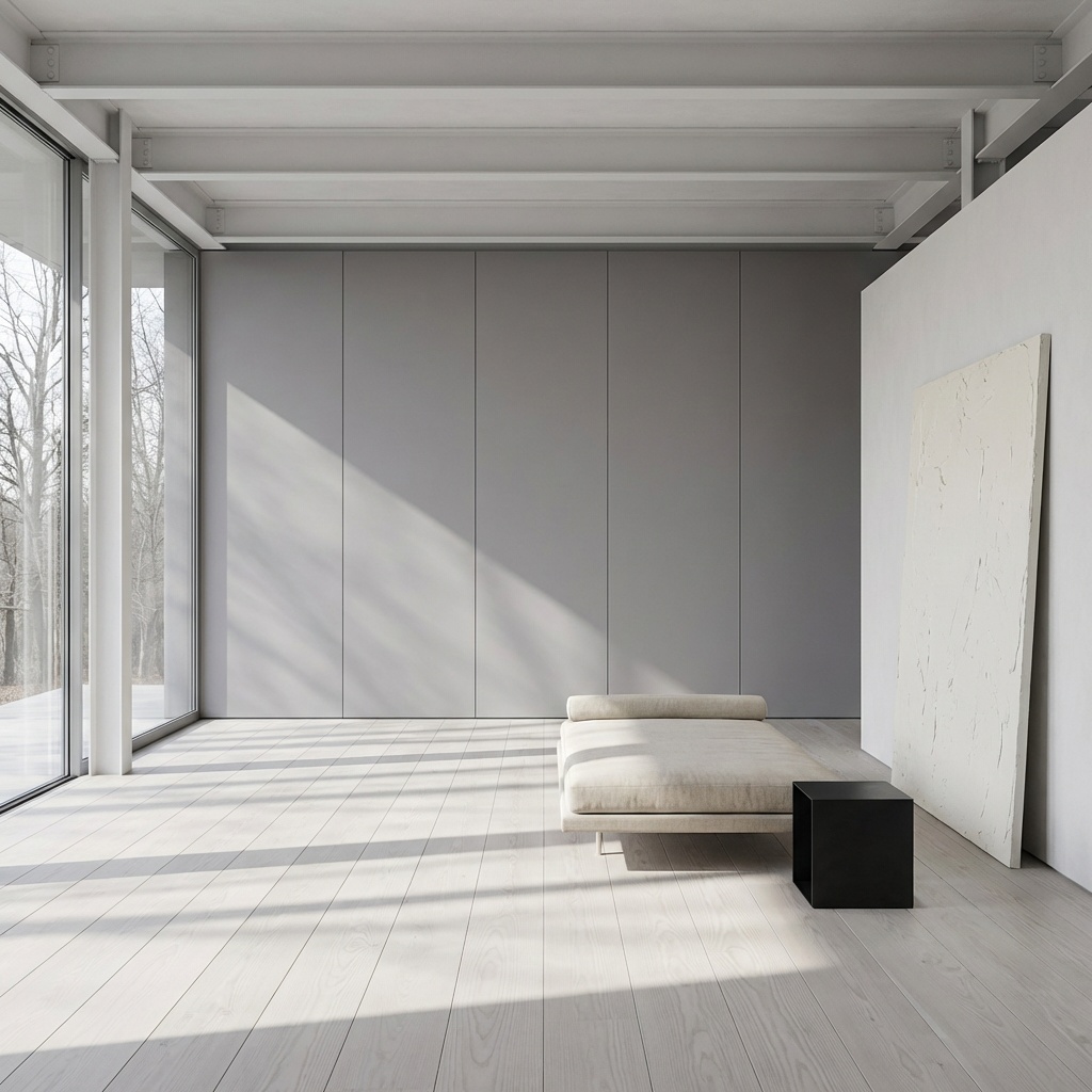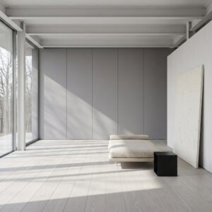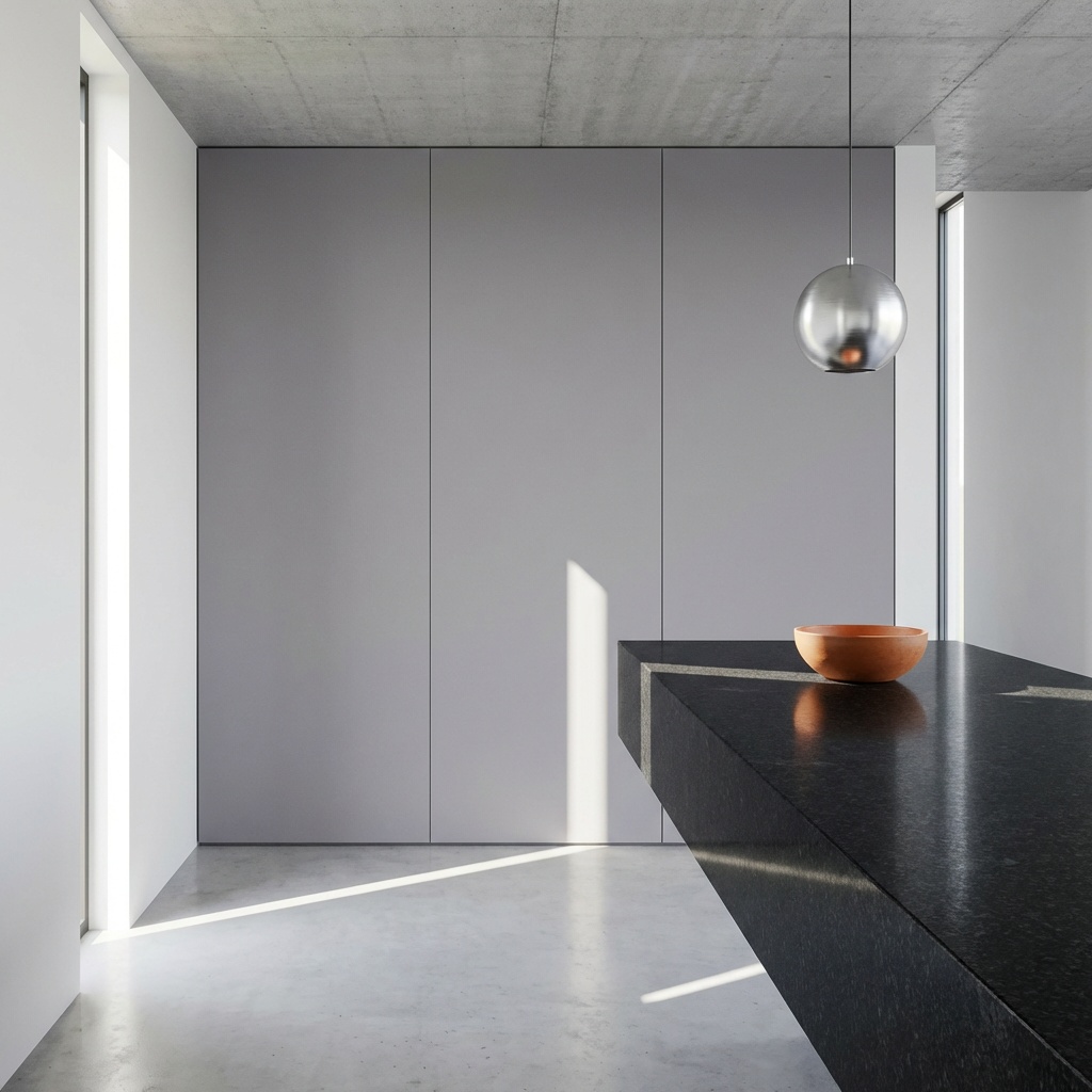 Jednolity jasnoszary kolor bez zmienności tonalnej, usytuowany dokładnie w centrum szarej skali. Matowe wykończenie rozkłada światło równomiernie bez punktowych refleksów i odblasków. Chłodny podton nawiązuje do surowego cementu i polerowanego zeolitu. Działa jak neutralne tło pozwalające wybrzmieć meblom i akcentom kolorystycznym