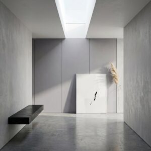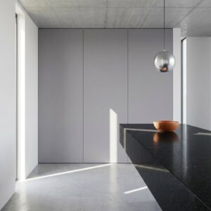 Panel węglowy Carbon Deco to gładka płaszczyzna w neutralnym jasnoszarym kolorze, która przywodzi na myśl wygładzony cement lub polerowany zeolit. Matowe wykończenie eliminuje odblaski i refleksy świetlne, tworząc spokojną powierzchnię idealną jako tło architektoniczne. Jednolity odcień bez tekstur i wzorów działa jak spoiwo przestrzeni — łączy kontrastujące materiały i pozwala wybrzmieć innym elementom wystroju. Panel o wymiarach 290 × 122 cm i grubości 5 mm montuje się przez klejenie bezpośrednie na podłoże.