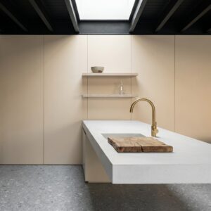 Panel węglowy Carbon Deco w odcieniu kremowym z brokatem to kompozycja delikatnej, złamanej bieli z piaskowym podtonem i mikroteksturą przypominającą najdelikatniejszy papier ścierny. Powierzchnia iskrzy się dyskretnym, perłowo-złocistym blaskiem widocznym pod bezpośrednim światłem, przywołując połysk macicy perłowej i satynowych tkanin. Efekt ten doskonale komponuje się z wnętrzami w stylu warm luxury, boho chic czy nowoczesnej klasyki, gdzie szuka się jasności z charakterem. Panel o wymiarach 2900×1220×5 mm wykonano z kompozytu mineralno-polimerowego o wodoodporności ≤0,5% z możliwością klejenia bezpośrednio na podłoże.