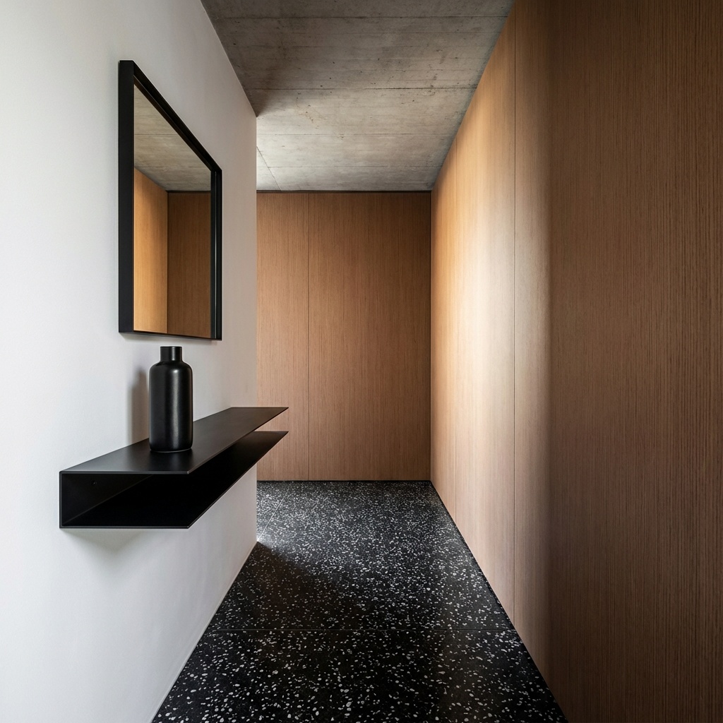 Panel węglowy Carbon Pro Orzech włoski prezentuje ciepły brąz z nutą kakaową i delikatnym pionowym usłojeniem imitującym naturalny fornir szlachetnego drewna. Matowa powierzchnia pochłania światło miękko, tworząc efekt elegancki boazerii bez odblasków, idealny do wnętrz w stylu japandi, mid-century modern czy ciepłego minimalizmu. Pionowy kierunek słojów optycznie wydłuża przestrzeń, a naturalny rysunek zachowuje organiczny charakter bez mechaniczności. Panel o grubości 15 mm z kompozytu mineralno-polimerowego zapewnia wodoodporność ≤0,5% i sztywność porównywalną z płytą OSB.