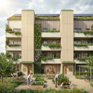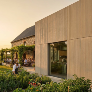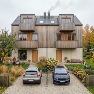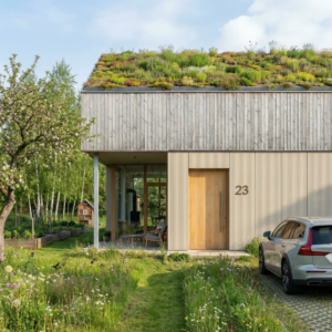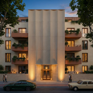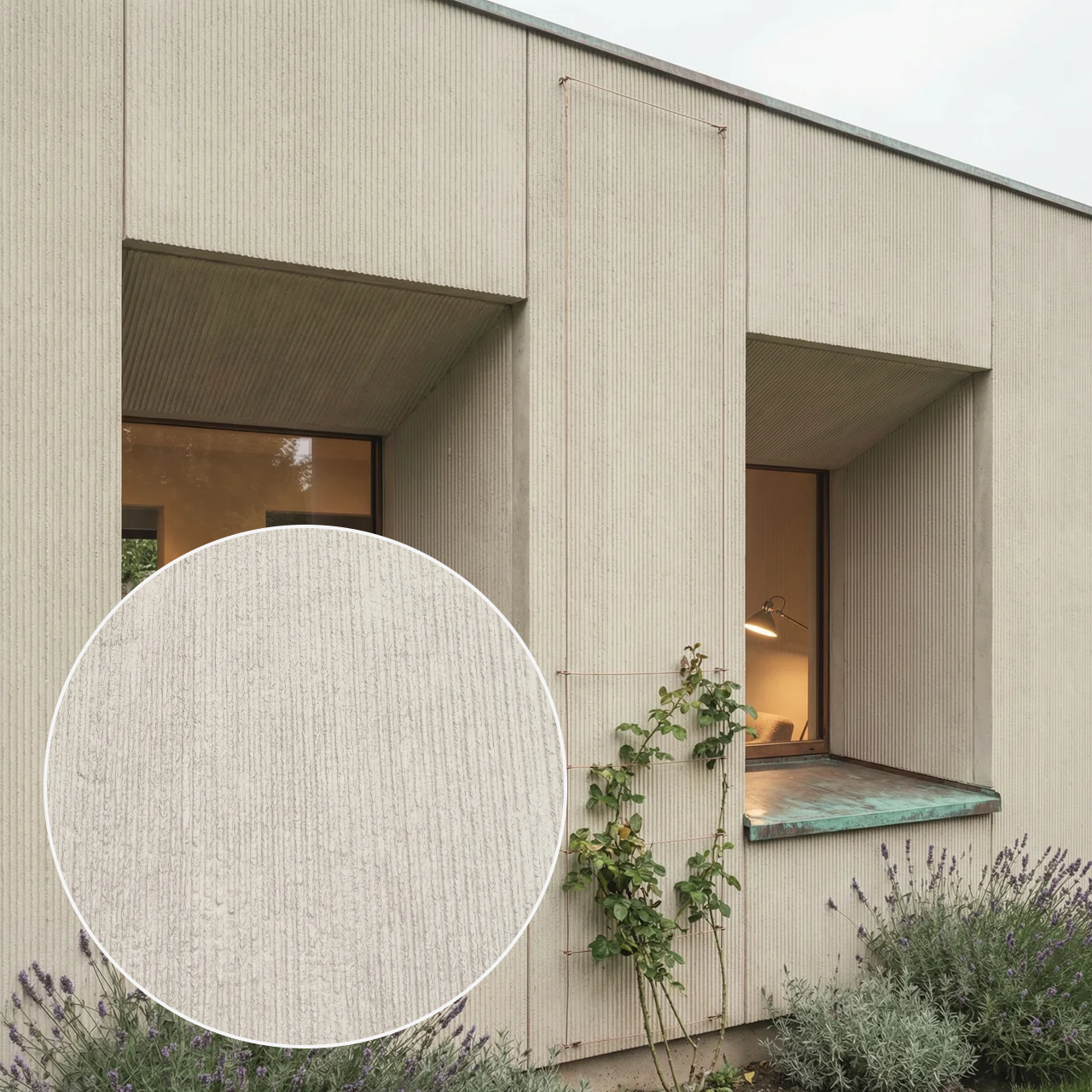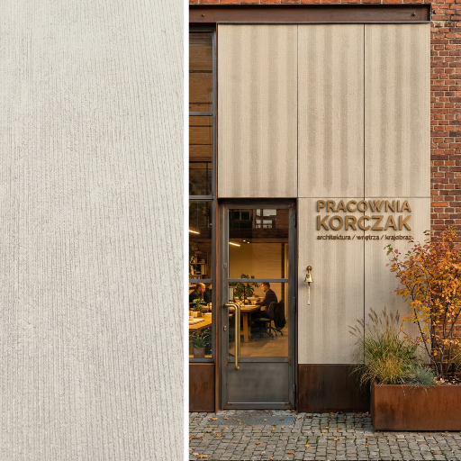 Płyta elewacyjna BOLD Mineral w kolorze beżowym o wymiarach 3000×1200 mm wykonana z kompozytu kwarcowo-polimerowego wytłaczanego pod wysokim ciśnieniem. Grubość panelu wynosi 7 mm, co umożliwia montaż bez znaczącego obciążenia konstrukcji elewacji. Charakterystyczna pionowa struktura z nieregularnymi żłobieniami odwzorowuje estetykę surowego betonu architektonicznego. Panel wykazuje pełną wodoodporność oraz odporność na promieniowanie UV, mróz i zmienne temperatury.