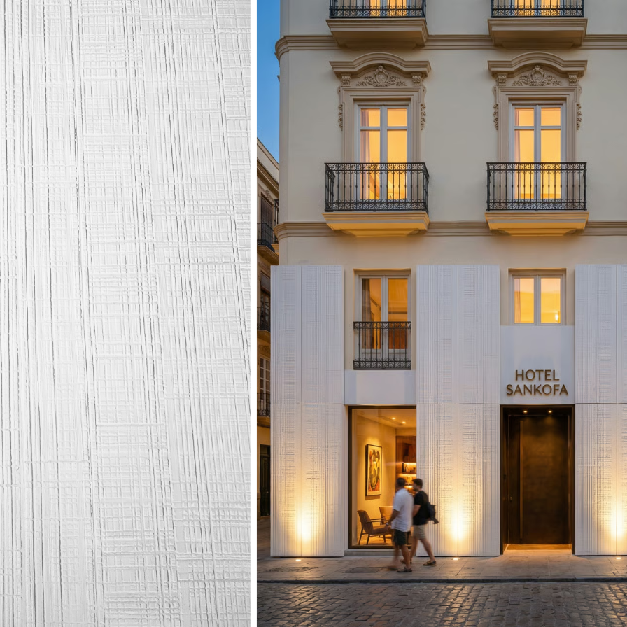 Płyta elewacyjna ETNO Mineral Biały o wymiarach 3000×1200 mm wykonana z kompozytu kwarcowo-polimerowego wytłaczanego pod wysokim ciśnieniem. Powierzchnia o grubości 7 mm charakteryzuje się unikalną teksturą inspirowaną afrykańską sztuką rzeźbiarską z nieregularną kratą żłobionych bloków. Materiał zapewnia pełną wodoodporność oraz odporność na promieniowanie UV, mróz i zarysowania. Panel umożliwia montaż na różnych podłożach metodą klejenia lub mechanicznego mocowania na ruszcie. Zastosowanie obejmuje elewacje budynków mieszkalnych, komercyjnych oraz wykończenie elementów konstrukcyjnych.
