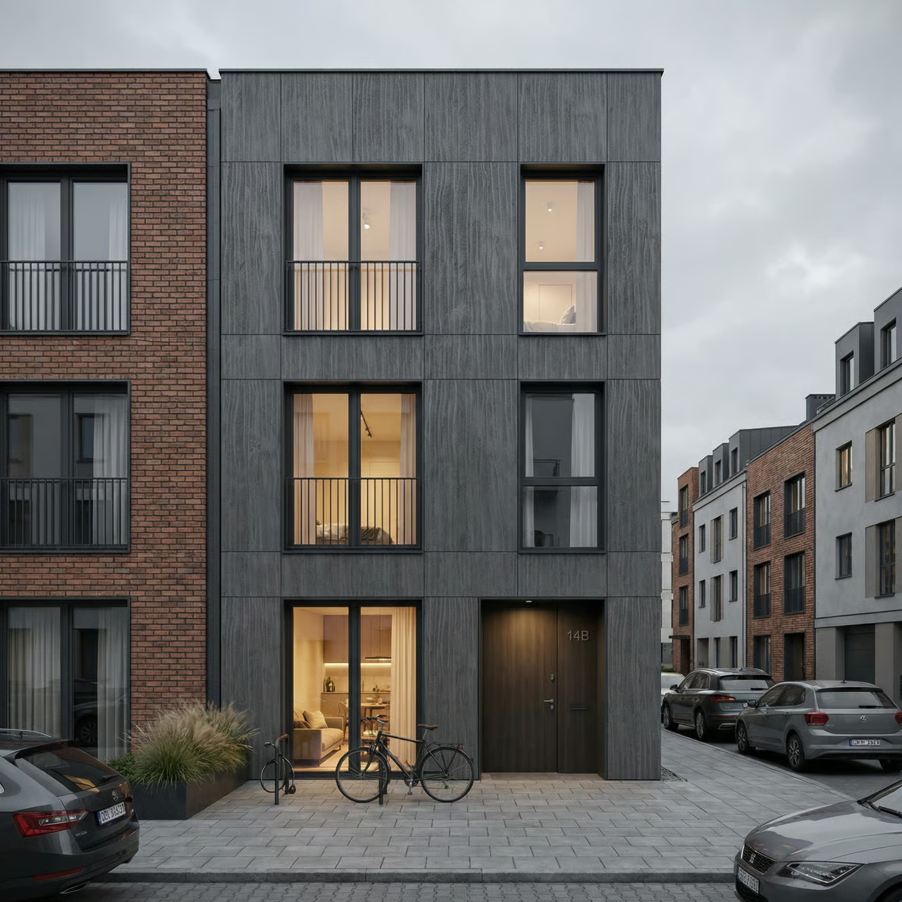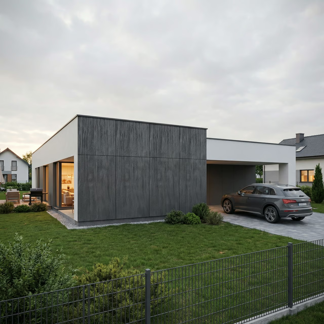 Płyta elewacyjna Onda Mineral Grigio o wymiarach 3000×1200 mm to nowoczesny panel wykonany z kompozytu kwarcowo-polimerowego wytłaczanego pod wysokim ciśnieniem. Powierzchnia odwzorowuje teksturę piasku ukształtowanego przez wodę z pionowymi, falistymi żłobieniami o organicznym przebiegu. Grubość 7 mm zapewnia łatwość montażu bez obciążania konstrukcji, a matowe wykończenie w ciemnym grafitowym odcieniu z ciepłym podtonem tworzy dynamiczny efekt gry światła i cienia. Panel charakteryzuje się pełną wodoodpornością oraz odpornością na promieniowanie UV, mróz i zmienne warunki atmosferyczne.