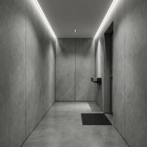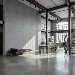 Odporność na wilgoć umożliwiająca zastosowanie w łazienkach · Łatwość czyszczenia i konserwacji powierzchni · Wzór szarego betonu o strukturze industrialnej · Trwały materiał zachowujący właściwości przez długi czas użytkowania