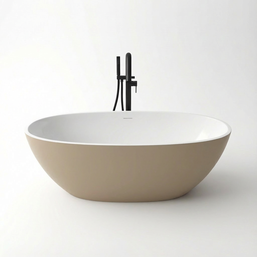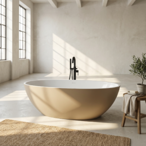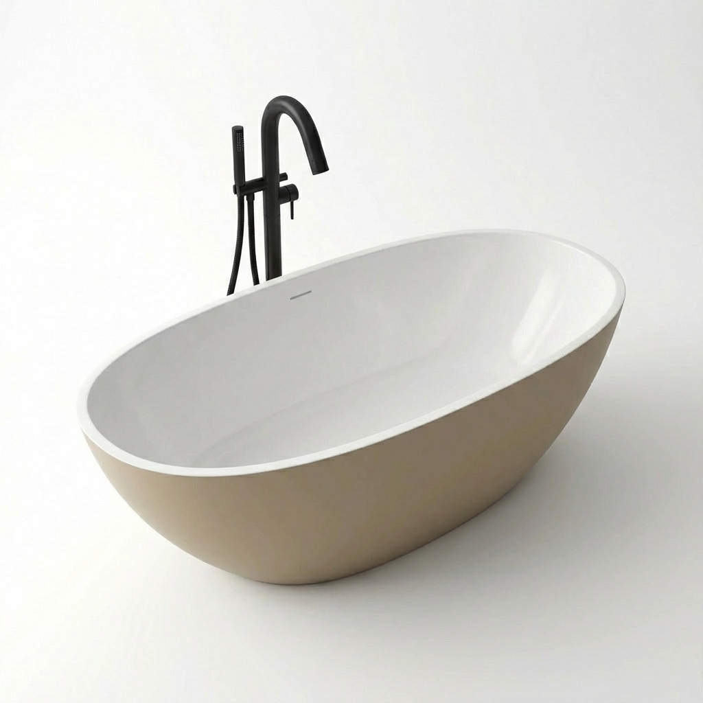 Wanna wolnostojąca BURSZTEEN H-5 SAND o wymiarach 170x78x56 cm wykonana z artificial stone (kompozytu mineralnego). Owalna, jajowata forma łączy elementy naturalne z nowoczesną estetyką. Dwukolorowe wykończenie obejmuje ciepły beżowy mat na zewnątrz oraz biały kolor wewnątrz. Bezporowata powierzchnia zapewnia łatwość czyszczenia i higieniczność użytkowania. Materiał charakteryzuje się retencją ciepła i możliwością naprawy drobnych uszkodzeń przez polerowanie.