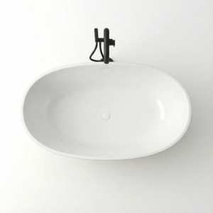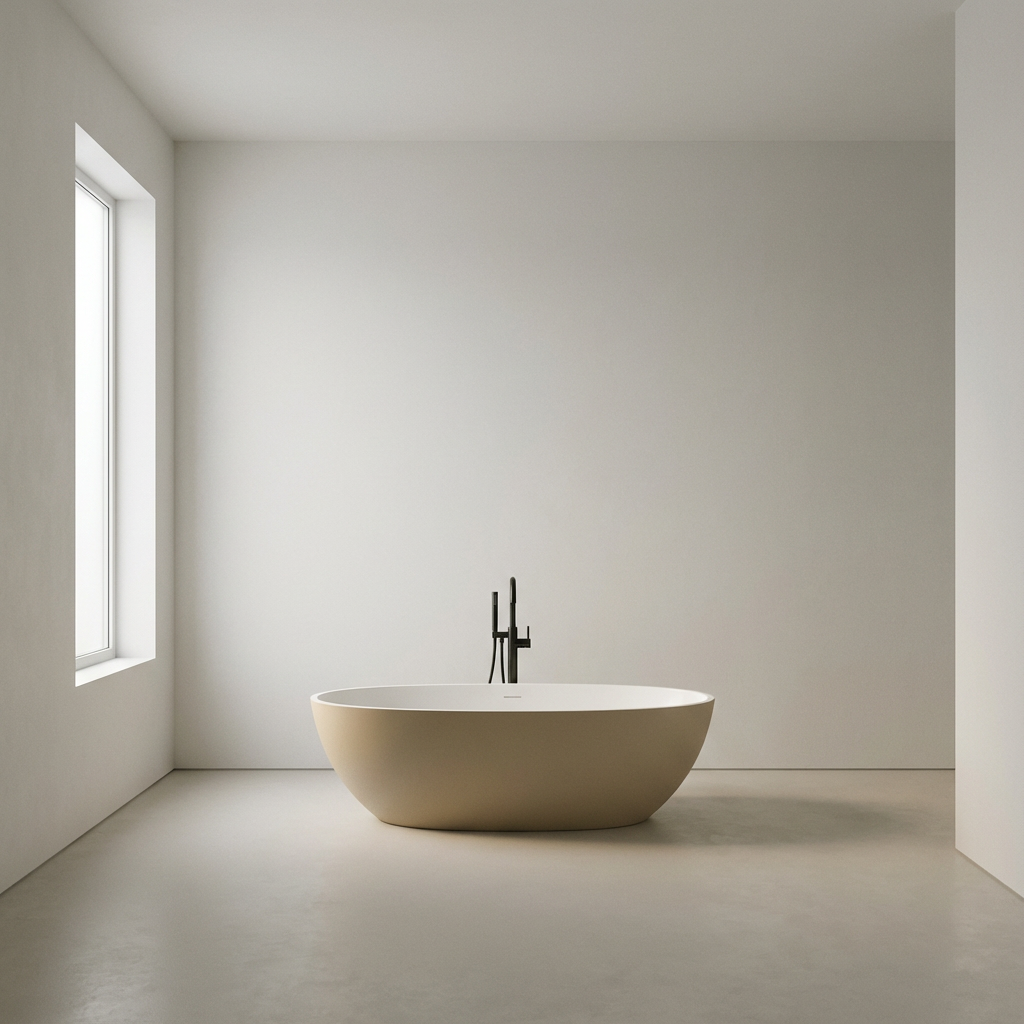 Owalna, jajowata sylwetka z płynnie zaokrąglonymi krawędziami · Ergonomiczny komfort kąpieli · Rzeźbiarski charakter formy · Połączenie naturalnych minerałów (marmur, kwarc) z żywicą akrylową · Bezporowata powierzchnia odporna na wchłanianie zabrudzeń i bakterii