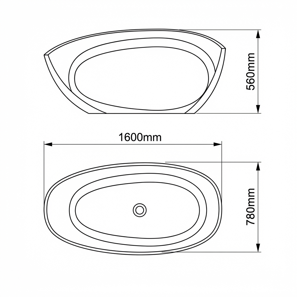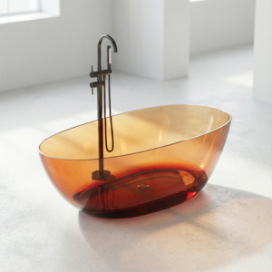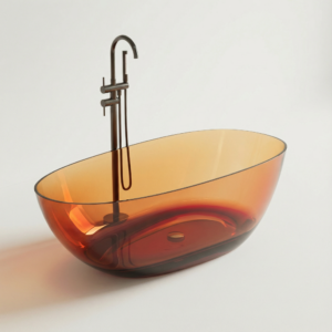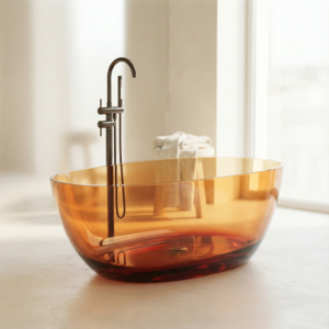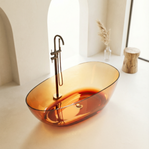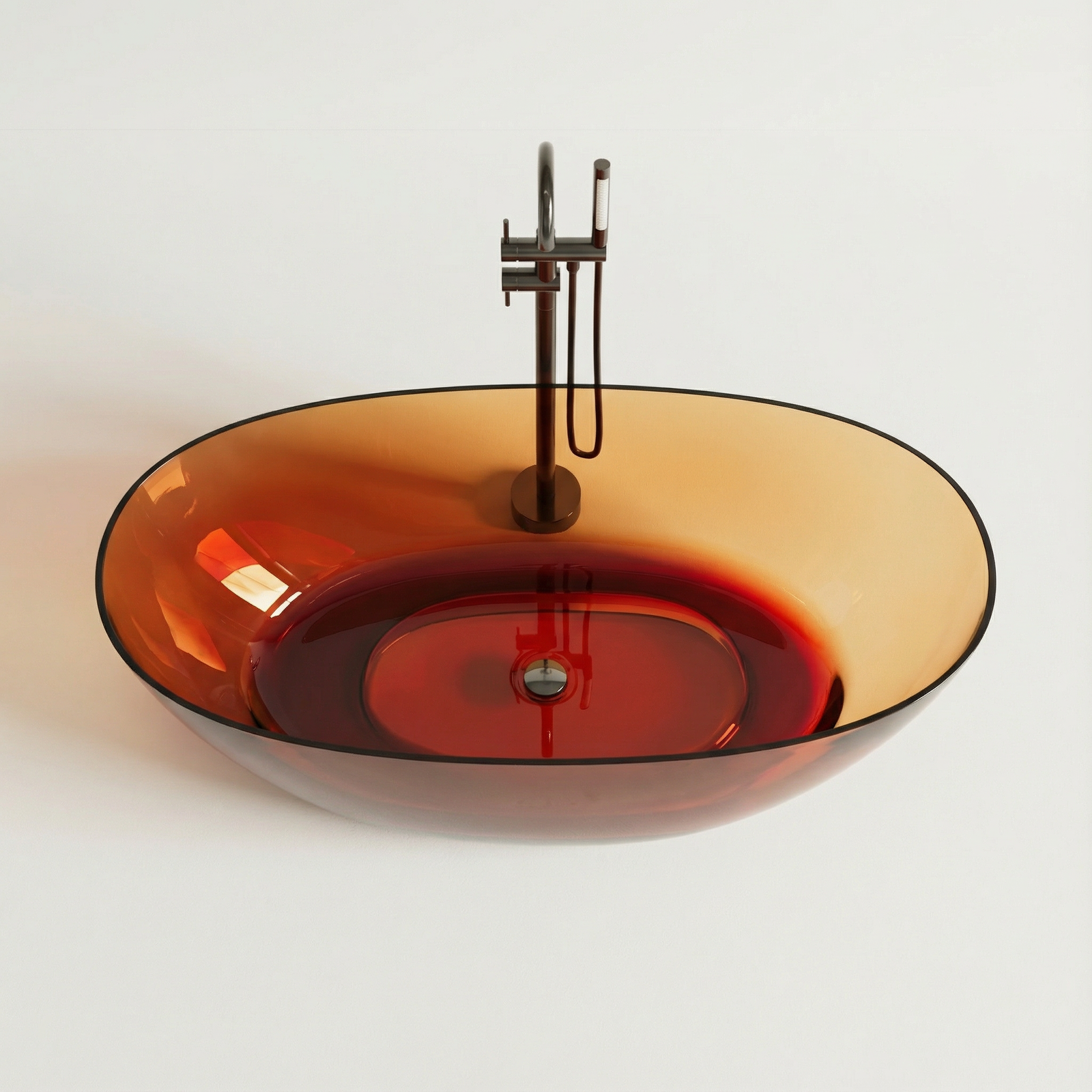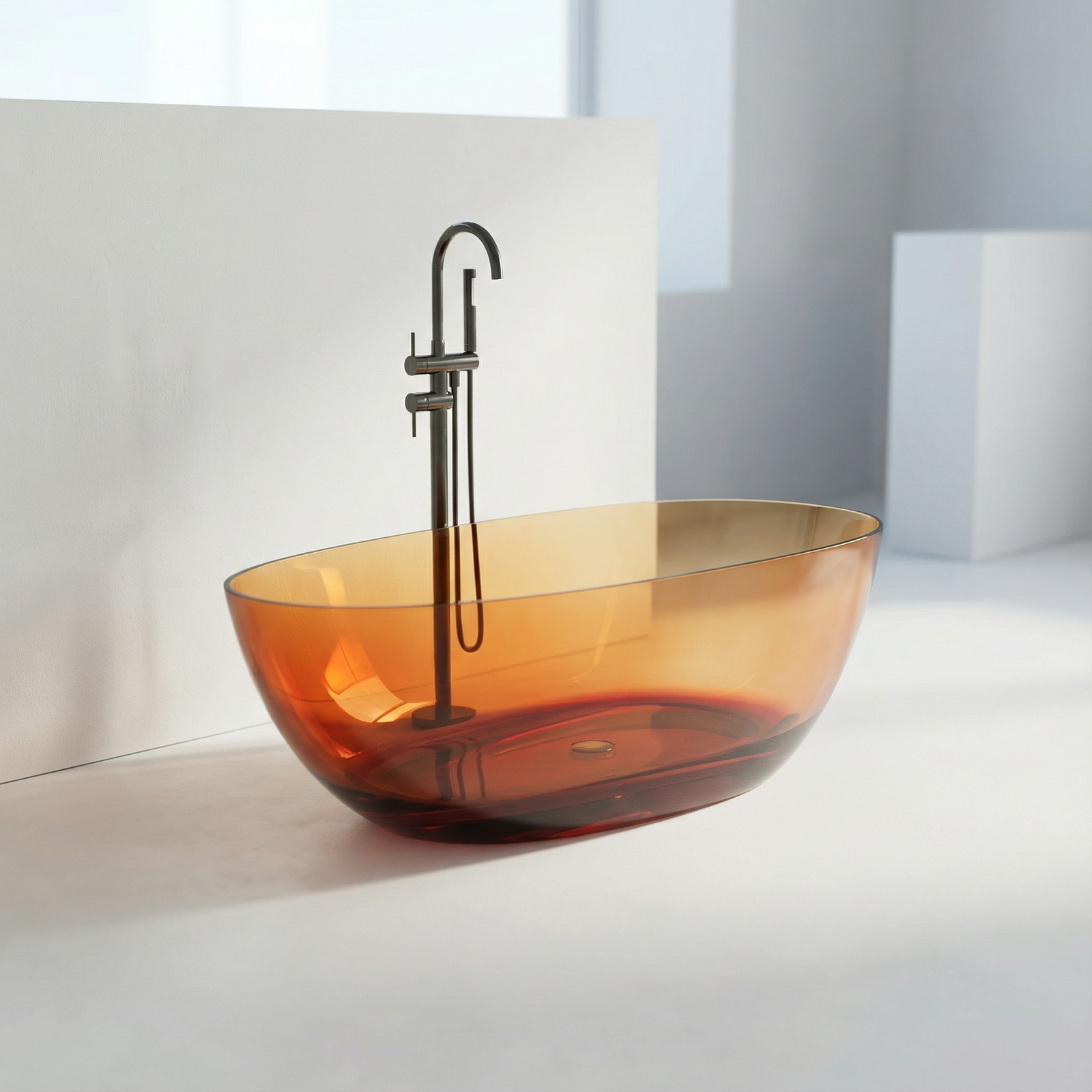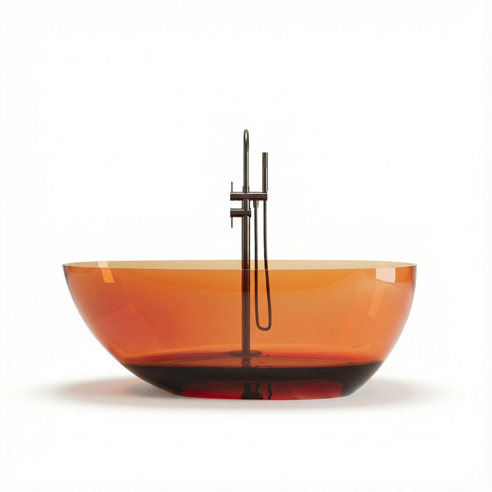 Wanna wolnostojąca BURSZTEEN H-8801A o wymiarach 160x78x56 cm wykonana z przezroczystej żywicy polimerowej o grubości ścianek około 20 mm. Owalna bryła w kolorze amber z charakterystycznym gradientem od głębszego miodowego tonu u podstawy do jaśniejszego bursztynowego na brzegach. Materiał żywicowy jest odporny na zarysowania, promieniowanie UV oraz temperatury do 60°C, zapewniając długotrwałą eksploatację. Bezporowata powierzchnia ułatwia czyszczenie i utrzymanie higieny, a efekt transparentności optycznie powiększa przestrzeń łazienki.