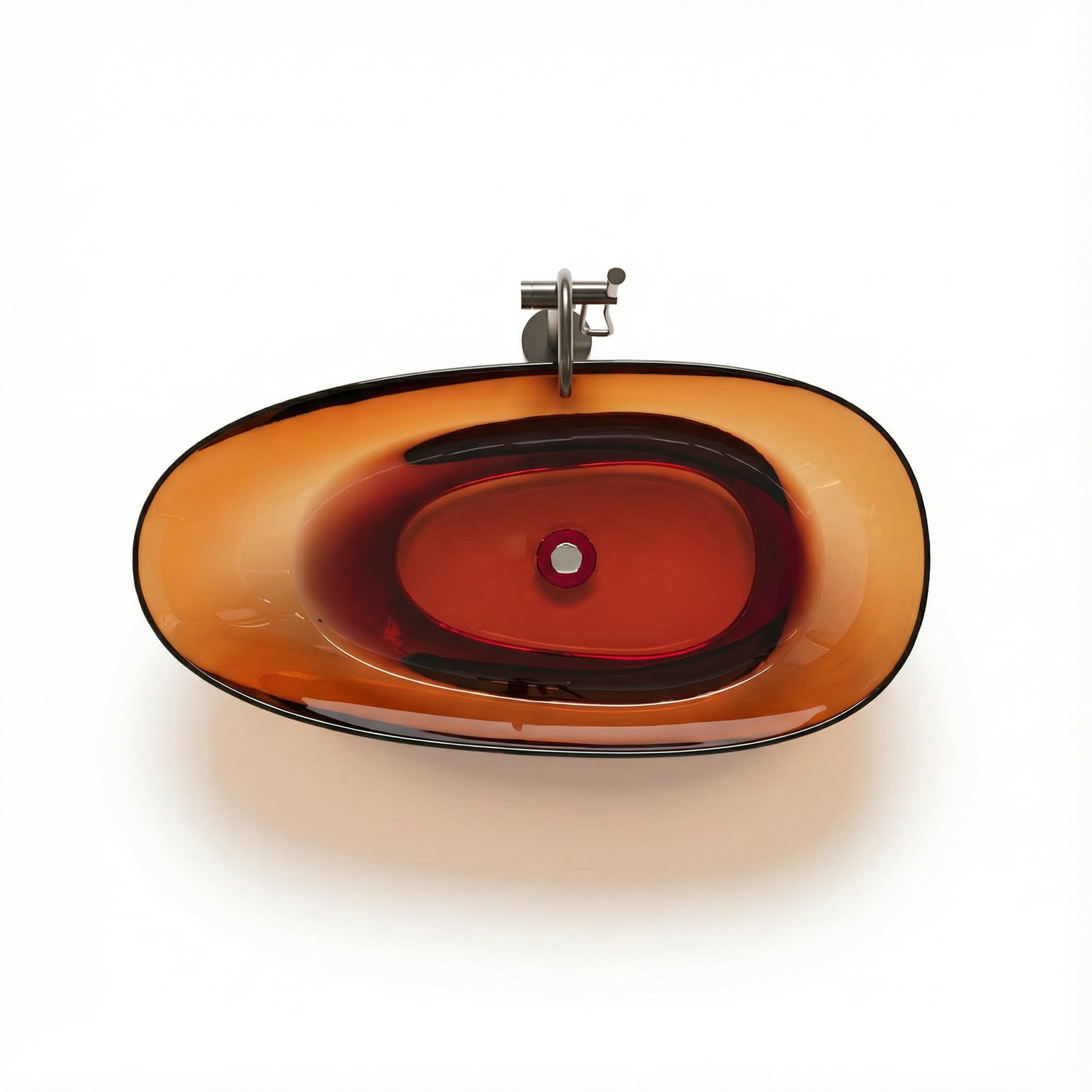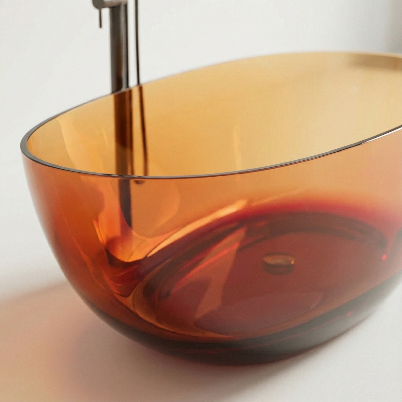 Owalna bryła wykonana z wysokowydajnej żywicy polimerowej o grubości ścianek około 20 mm · Charakterystyczny gradient kolorystyczny od głębszego miodowego tonu u podstawy do jaśniejszego bursztynowego na brzegach · Transparentny materiał zapewniający efekt lekkości i elegancji · Bezporowata powierzchnia nieprzepuszczalna i przyjemna w dotyku