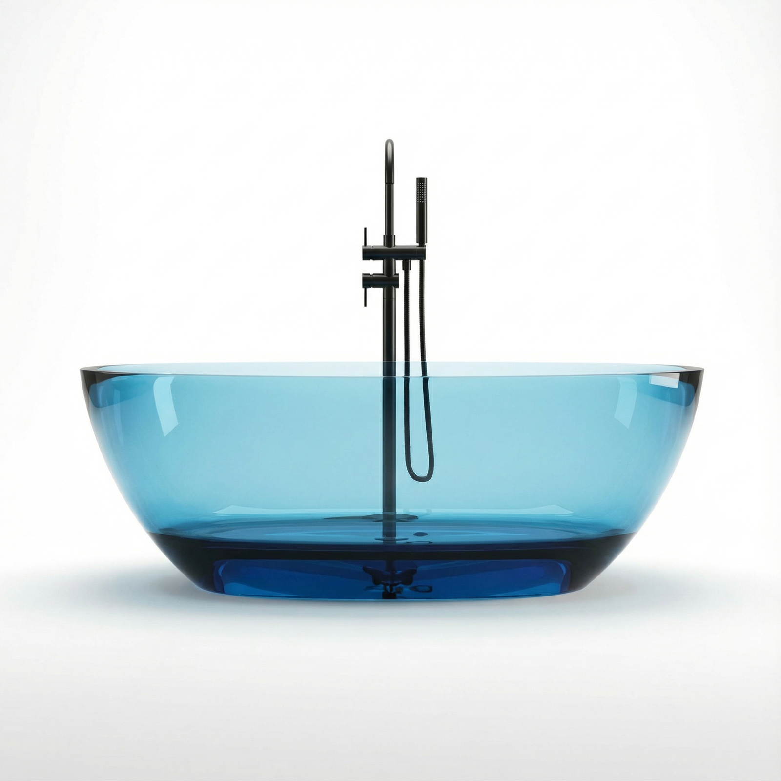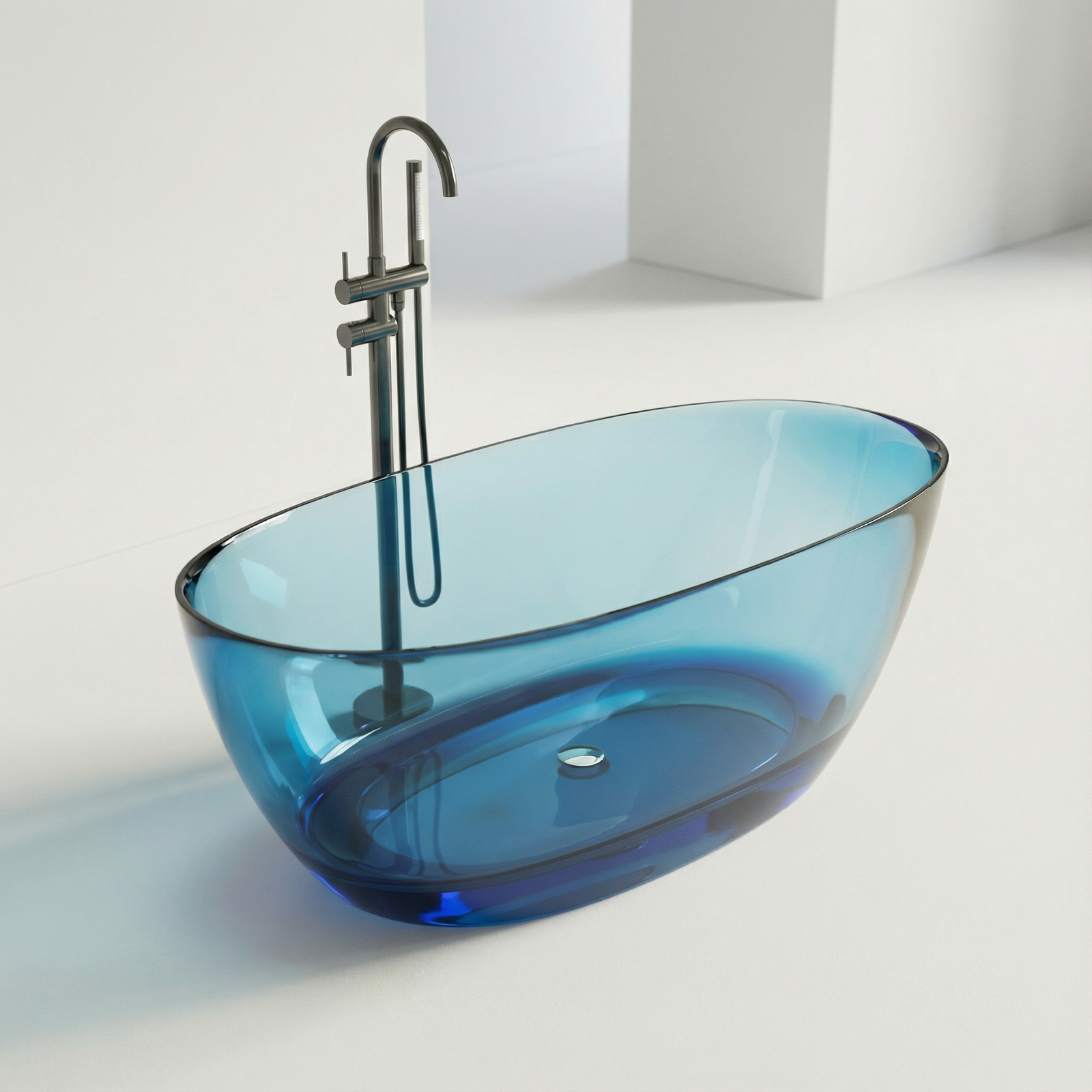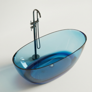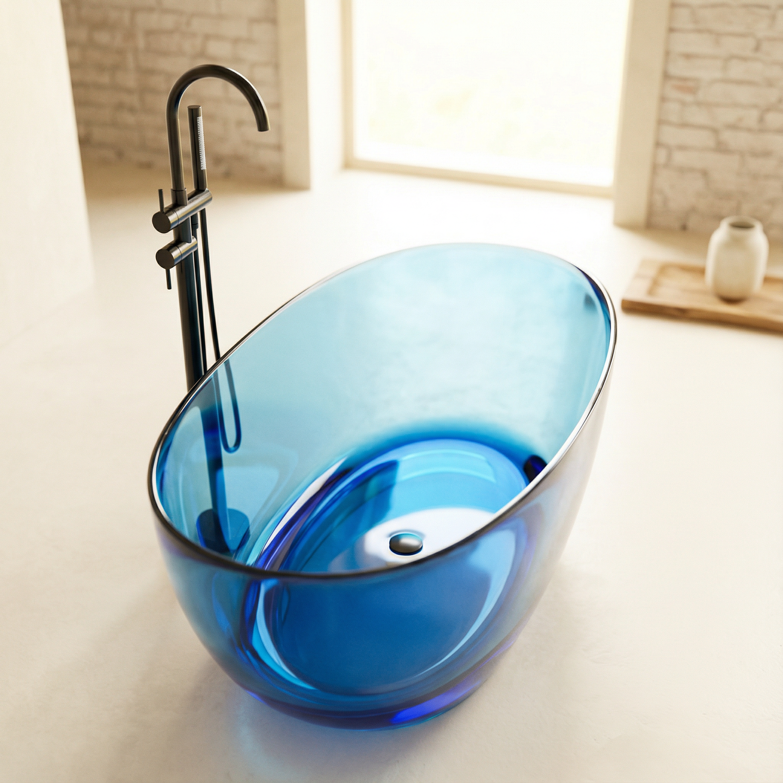 Wanna wolnostojąca BURSZTEEN H-8801B o wymiarach 160x78x56 cm wykonana z przezroczystej żywicy polimerowej w błękitnym odcieniu. Grubość ścianek wynosi około 20 mm, co zapewnia doskonałą stabilność konstrukcji i długotrwałe utrzymanie temperatury wody. Owalna forma o przezroczystej konstrukcji pozwala na przepuszczanie światła, tworząc spektakularne efekty wizualne. Żywica jest materiałem bezpiecznym, nieprzepuszczalnym i higienicznym o powierzchni odpornej na plamy. Doskonale komponuje się z nowoczesnymi wnętrzami w stylu contemporary, modern spa i high-tech.