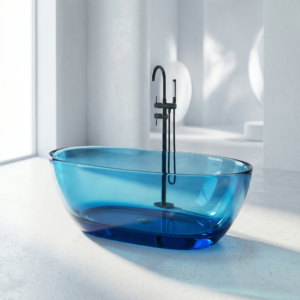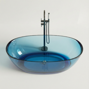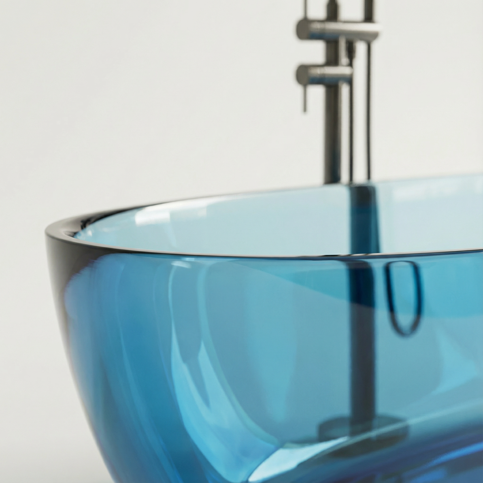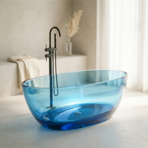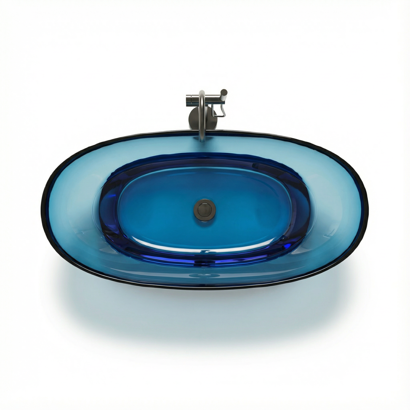 Wanna wolnostojąca BURSZTEEN H-8801B o wymiarach 160x78x56 cm wykonana z przezroczystej żywicy polimerowej w błękitnym odcieniu. Grubość ścianek wynosi około 20 mm, co zapewnia doskonałą stabilność konstrukcji i długotrwałe utrzymanie temperatury wody. Owalna forma o przezroczystej konstrukcji pozwala na przepuszczanie światła, tworząc spektakularne efekty wizualne. Żywica jest materiałem bezpiecznym, nieprzepuszczalnym i higienicznym o powierzchni odpornej na plamy. Doskonale komponuje się z nowoczesnymi wnętrzami w stylu contemporary, modern spa i high-tech.