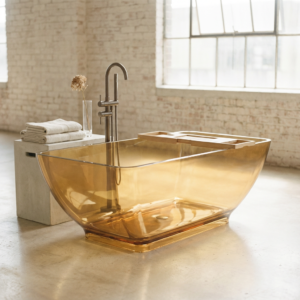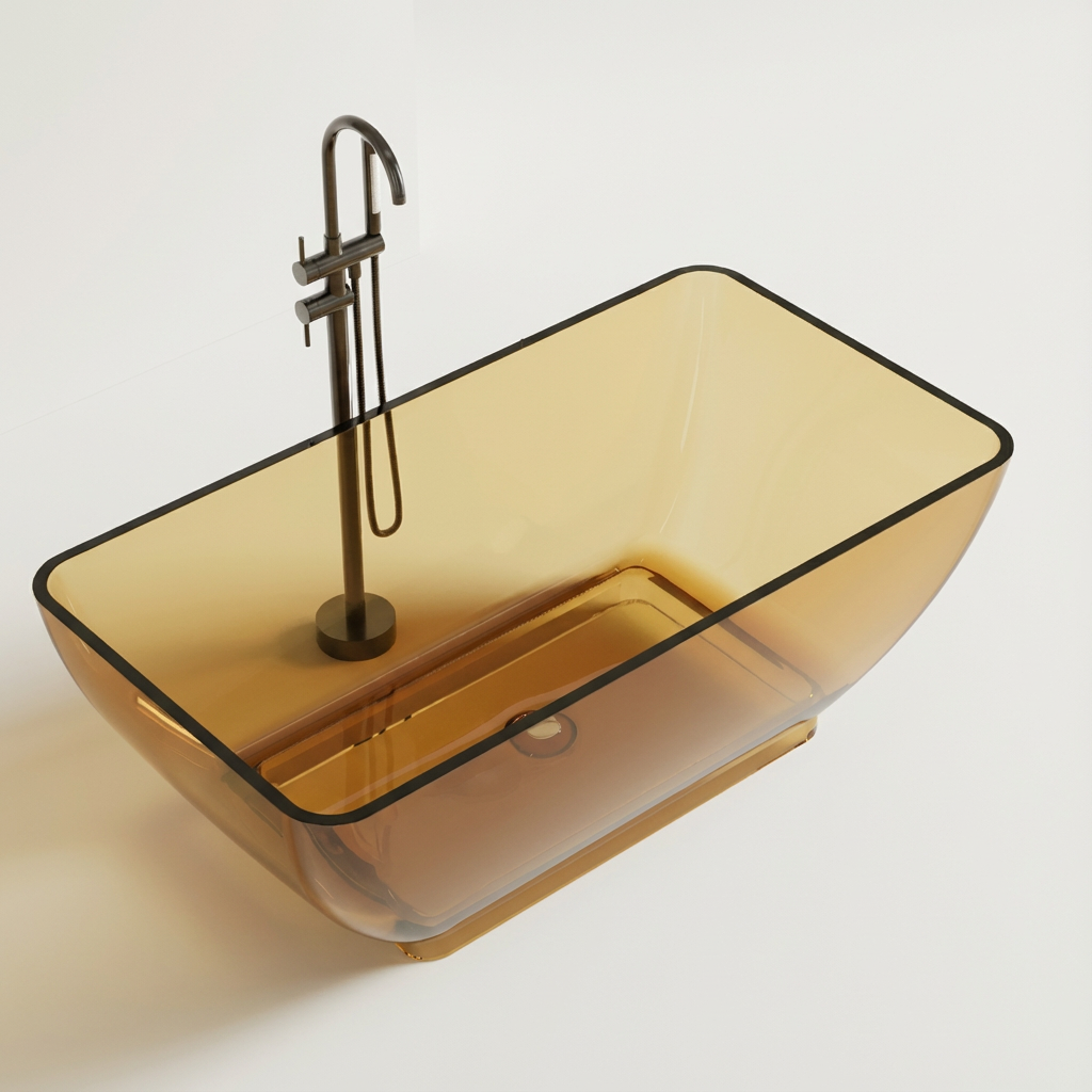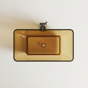 Wanna wolnostojąca LUMINA AMBER 162x87x60 cm z przezroczystej żywicy. Bursztynowy odcień, czarna obwódka, lekka konstrukcja 45 kg.