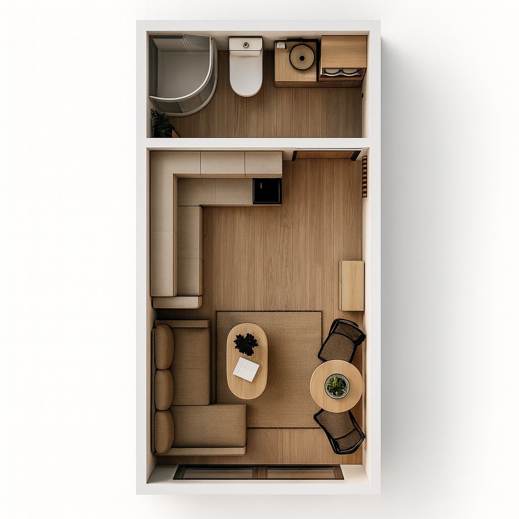 Мікробудинок H1 — це універсальне рішення для багатьох застосувань. Він може бути першим власним домом, офісом у саду, соціальним приміщенням для працівників або об’єктом під оренду. Нейтральний фасад в антрацитовому кольорі (з опцією чорного або золотого дуба) дозволяє інтегрувати будинок у будь-яке оточення. Це простір, який легко адаптувати до власних потреб та стилю життя.